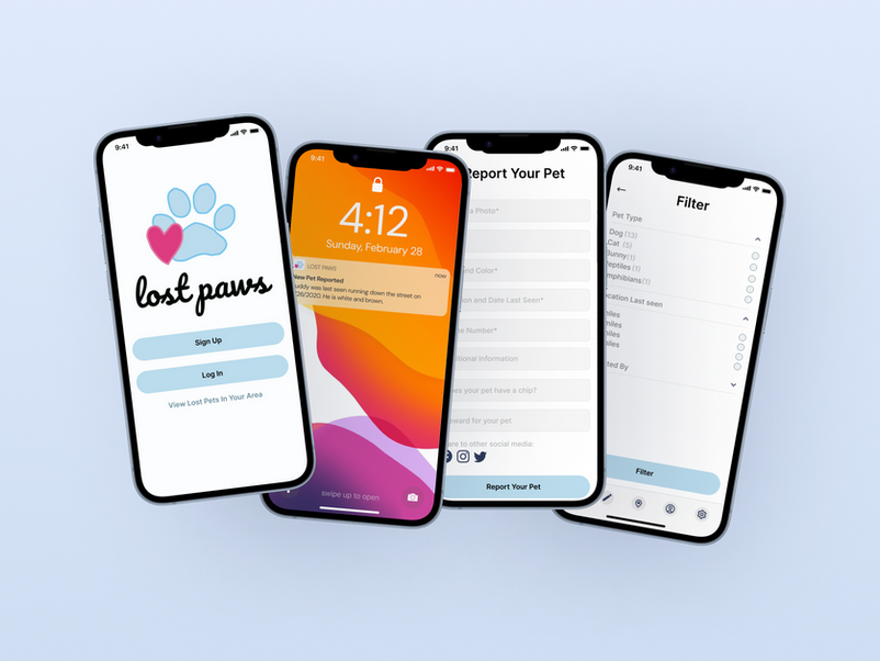 This app would sync with local veterinary offices and animal shelters. Users can report a lost or found pet. It would have a map showing location, various information about the pet and ways to contact the owners. Users can get notifications and can also change the colors to suite their preference.